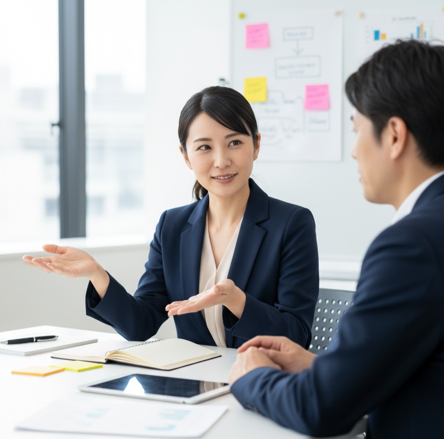 「上司からの急な残業依頼を角が立たないように断りたい時」 「同僚に仕事のやり方を少し変えてほしいとお願いしたい時」 など、具体的な場面を想定したロールプレイングを通して「私にも言えた!」という成功体験を積むことができます。